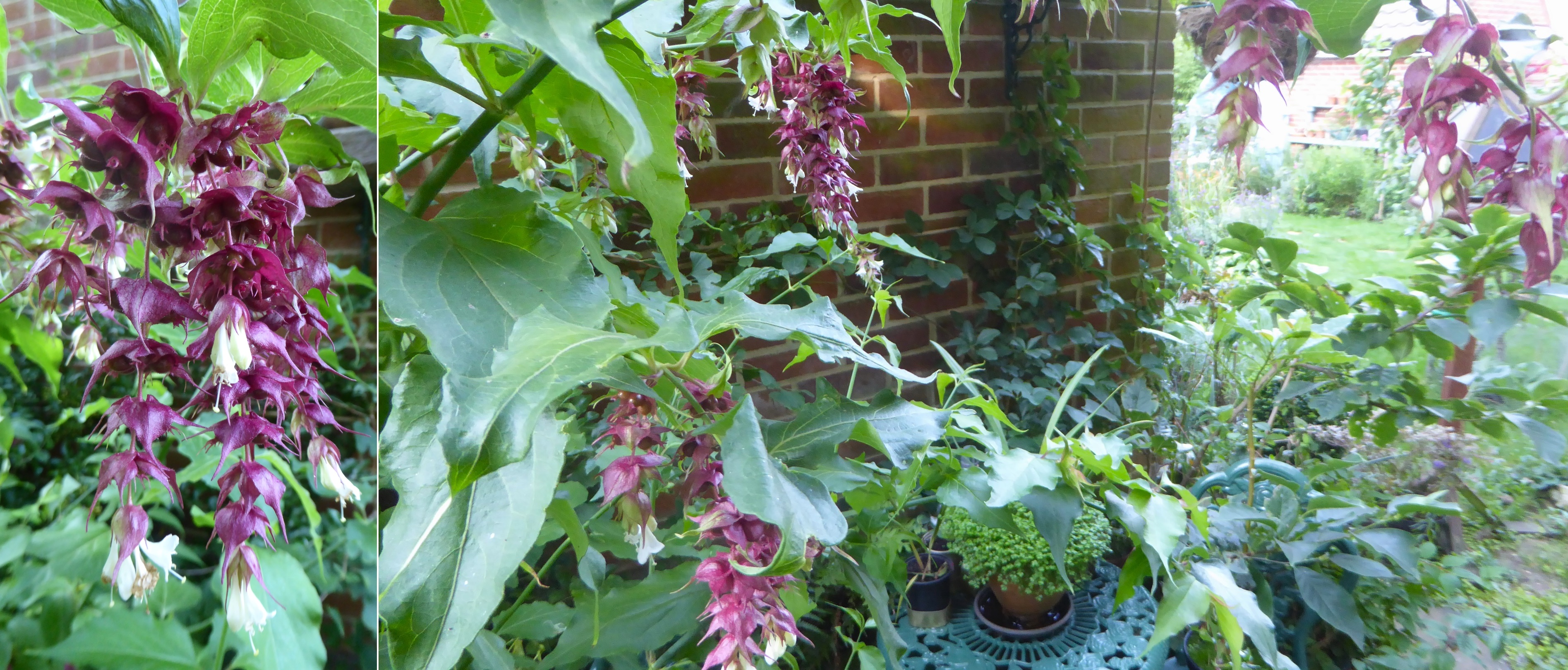 The Gardeners Retreat as seen through a flowering & fruiting Himalayan honeysuckle (Leycesteria formosa), AKA pheasant berry. The berries taste of treacle.